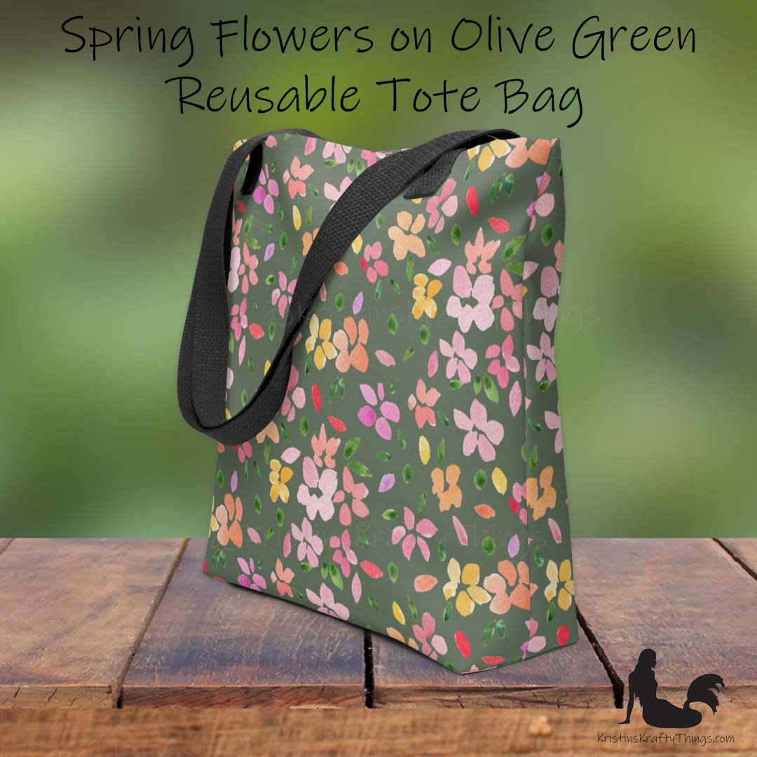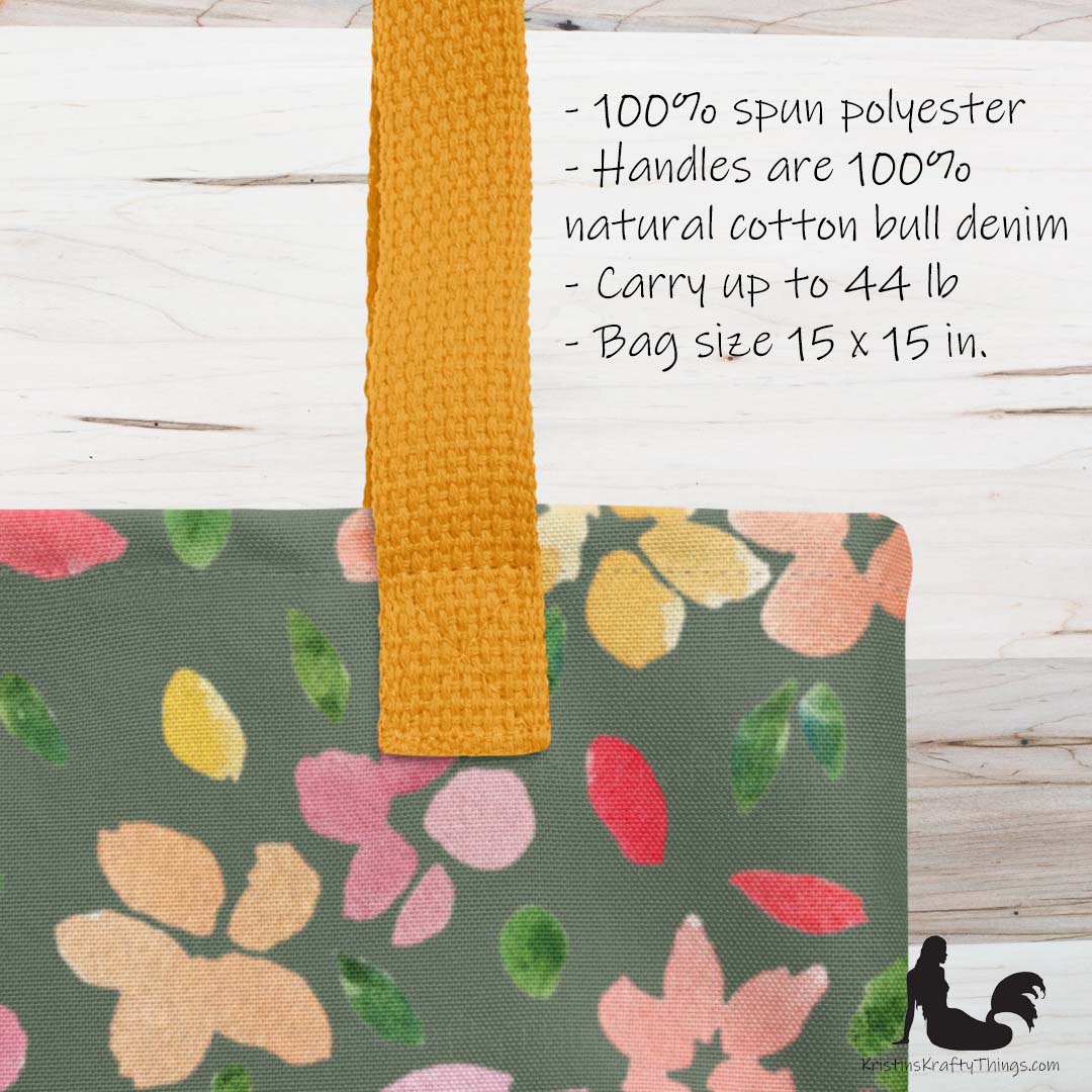 All-over full color print from original watercolor painting made by me! These beautiful spring to summer flowers and leaves dance about this spacious tote bag to help you carry around everything that matters. 🌸 The flowers are in shades of pink, peach, and yellow with green leaves adorning them on an olive green background.